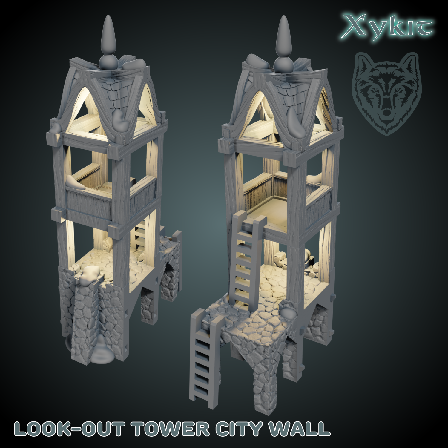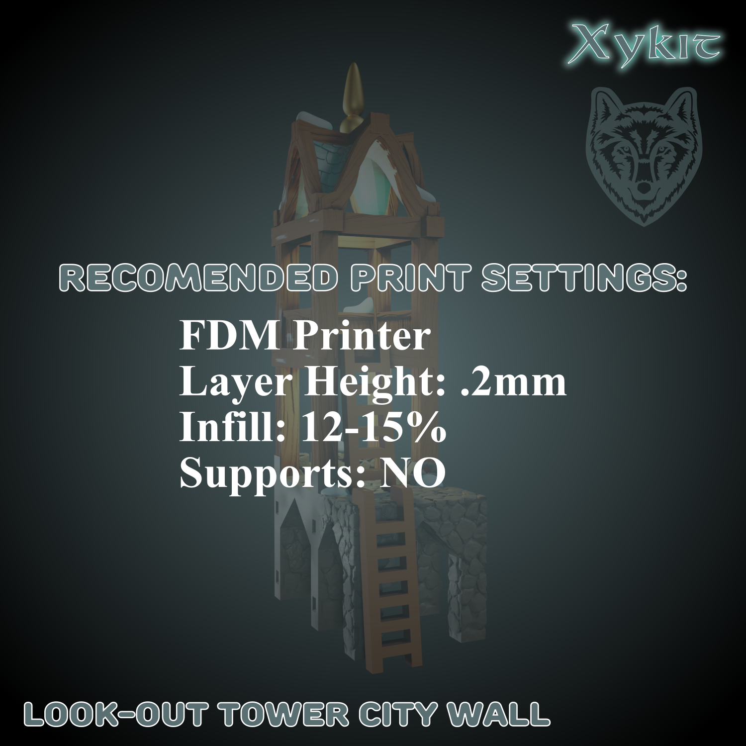 The Look-out tower fits into the city walls and prints in multiple pieces. Base, lift off platform and roof along with a ladder. Great for skirmish games, or tabletop rpgs.