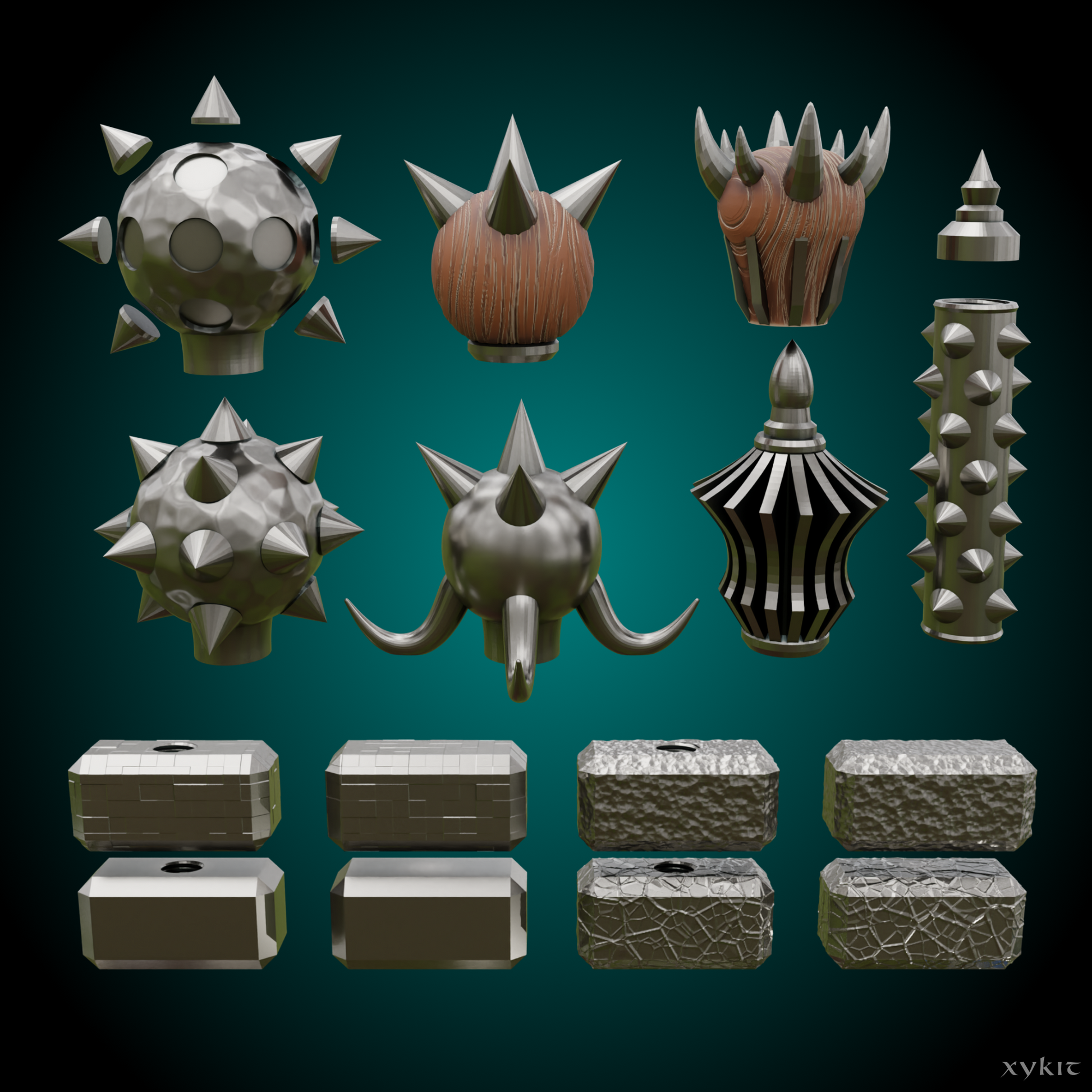A collection of Mallets and Maces for your prop collection, along with some hammer tops and a variety of handle/connector pieces. The standard mace comes with spikes attached (needs supports) or with separate spikes, which can be printed without supports but may benefit from some limited supports to prevent sagging (I printed it without any supports)