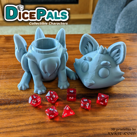 This unique Dice Pal will hold 1 standard sized (19mm, D20), 11 piece set of RPG tabletop dice. It twists open to reveal secret storage inside.