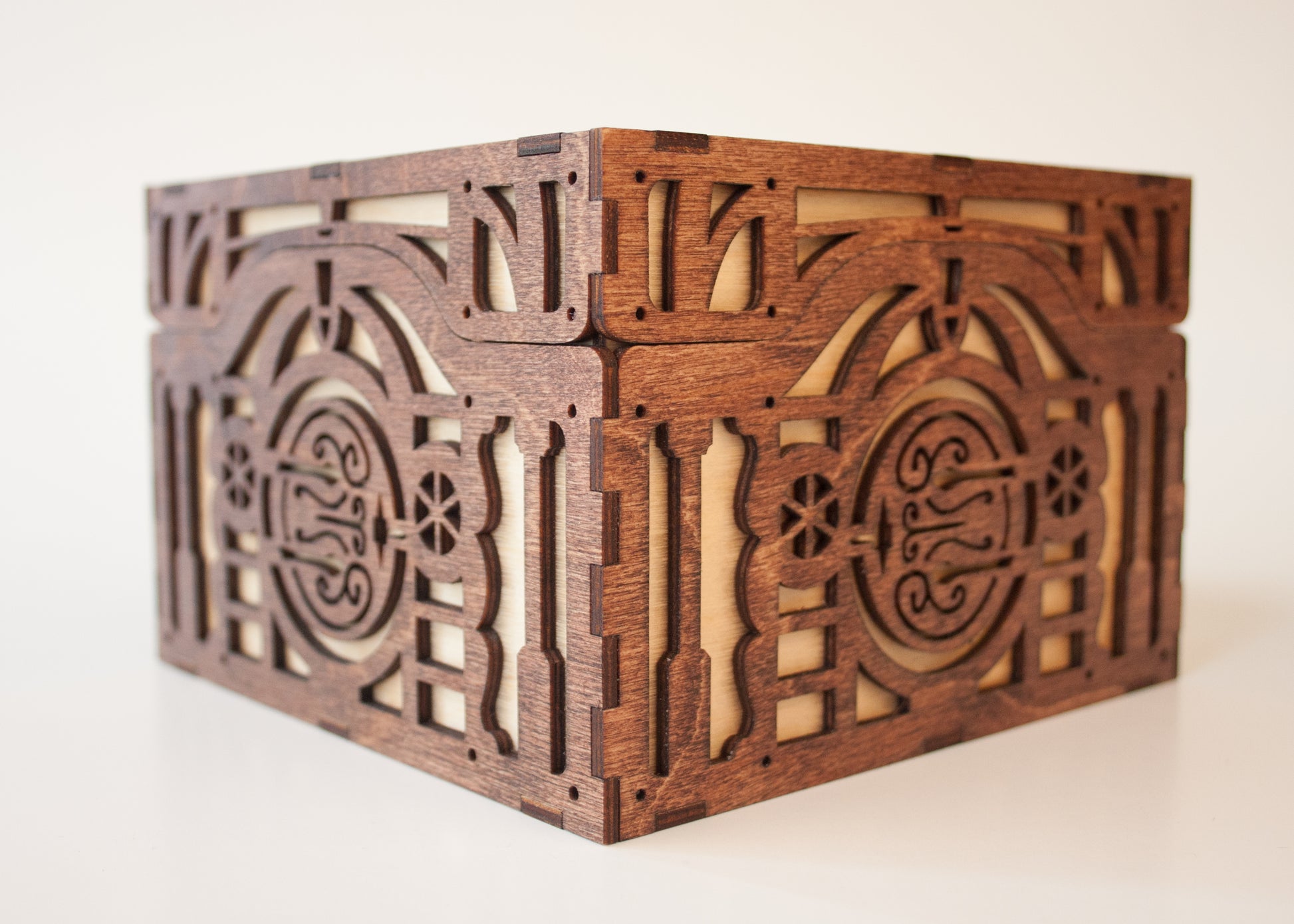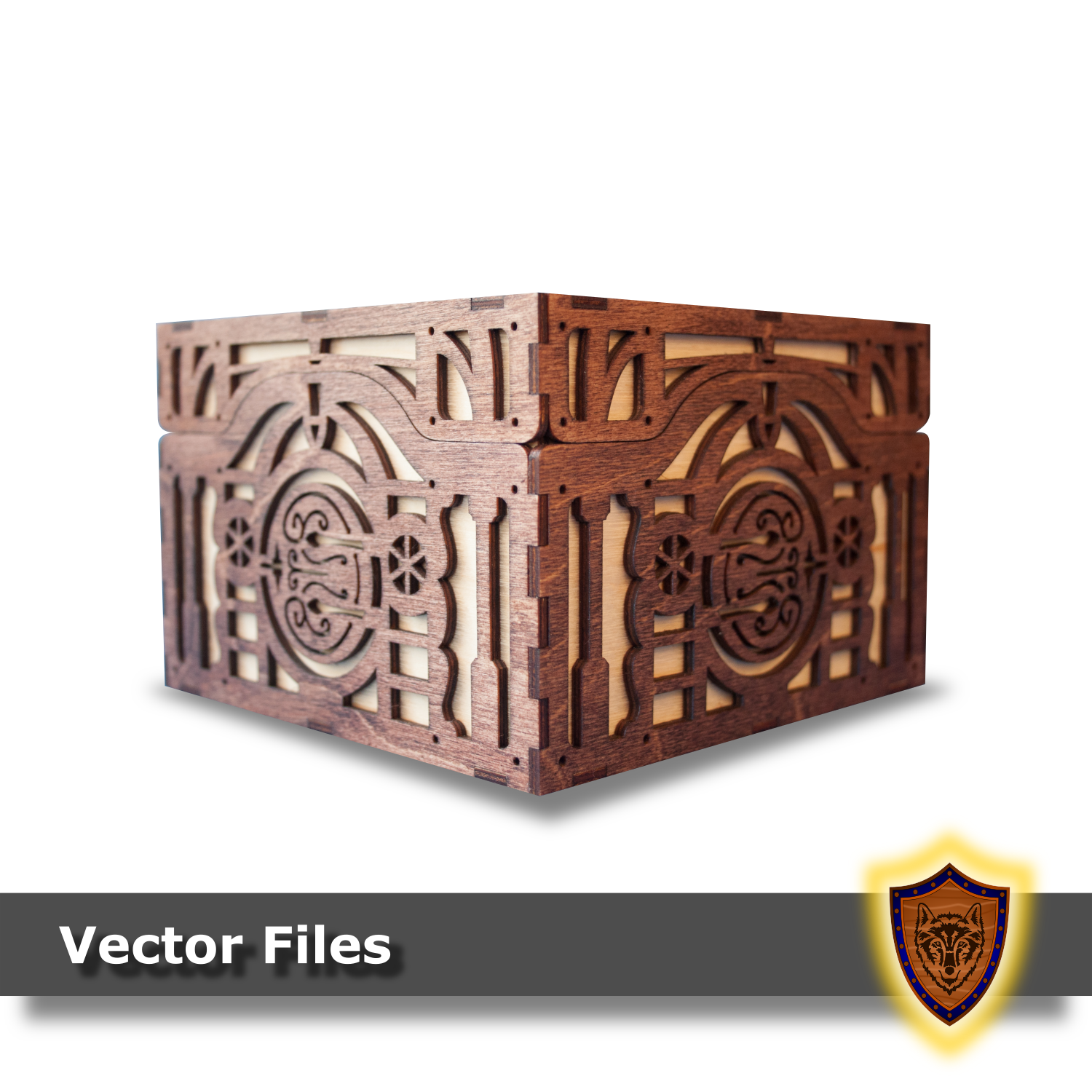 This intricately cut Fantasy Box design features Halfling motifs and is designed for gamers. It can be combined with our Fantasy Box Tray files (sold separately) to add custom storage for cards, dice, miniatures, tokens and more.