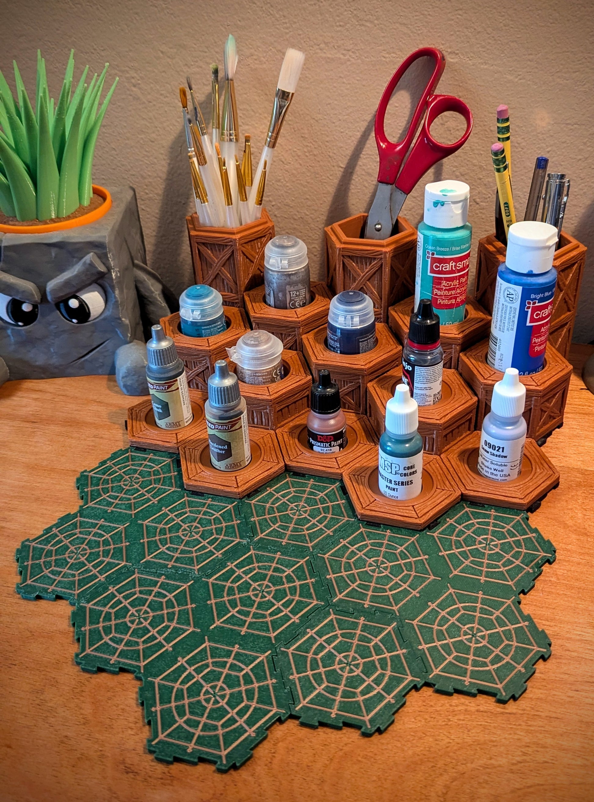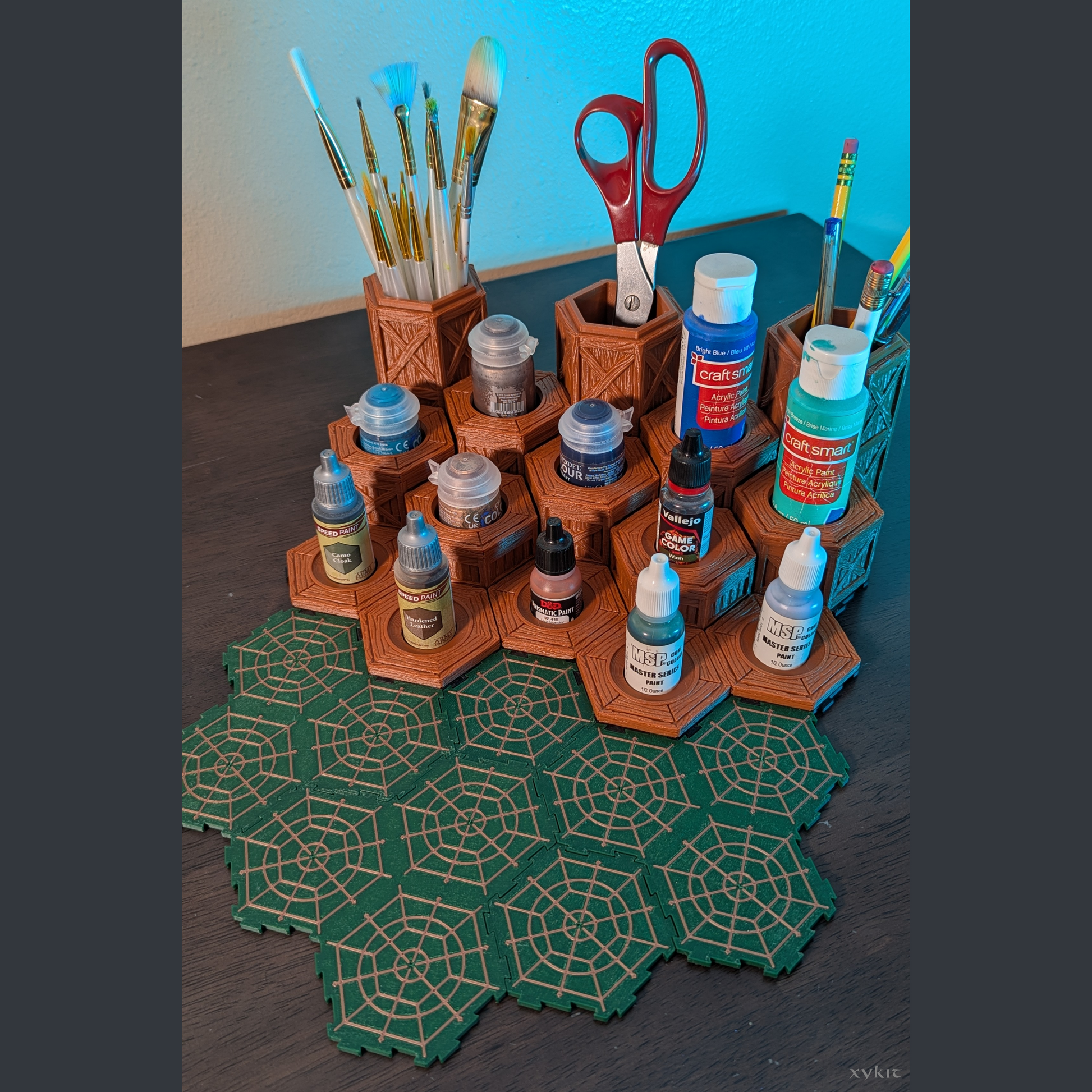 For July, we got a modular hobby station with a base grid, risers, and a variety of cups for your different paints. There's also some taller riser cups that can be used to store brushes, pencils, or scissors. Build yourself a little work station on your desk, or go huge, totally up to you. There is also a *cutting mat grid that can be used to protect you desk from paint and and scratches (see details below).