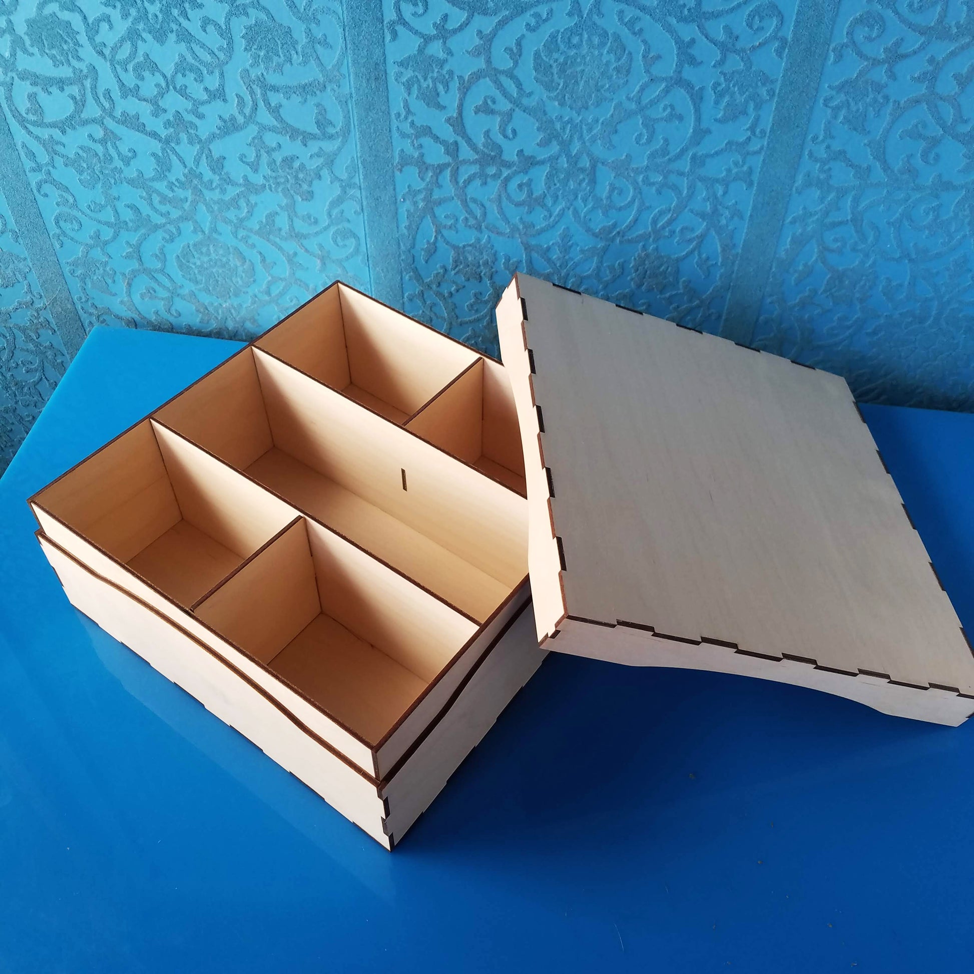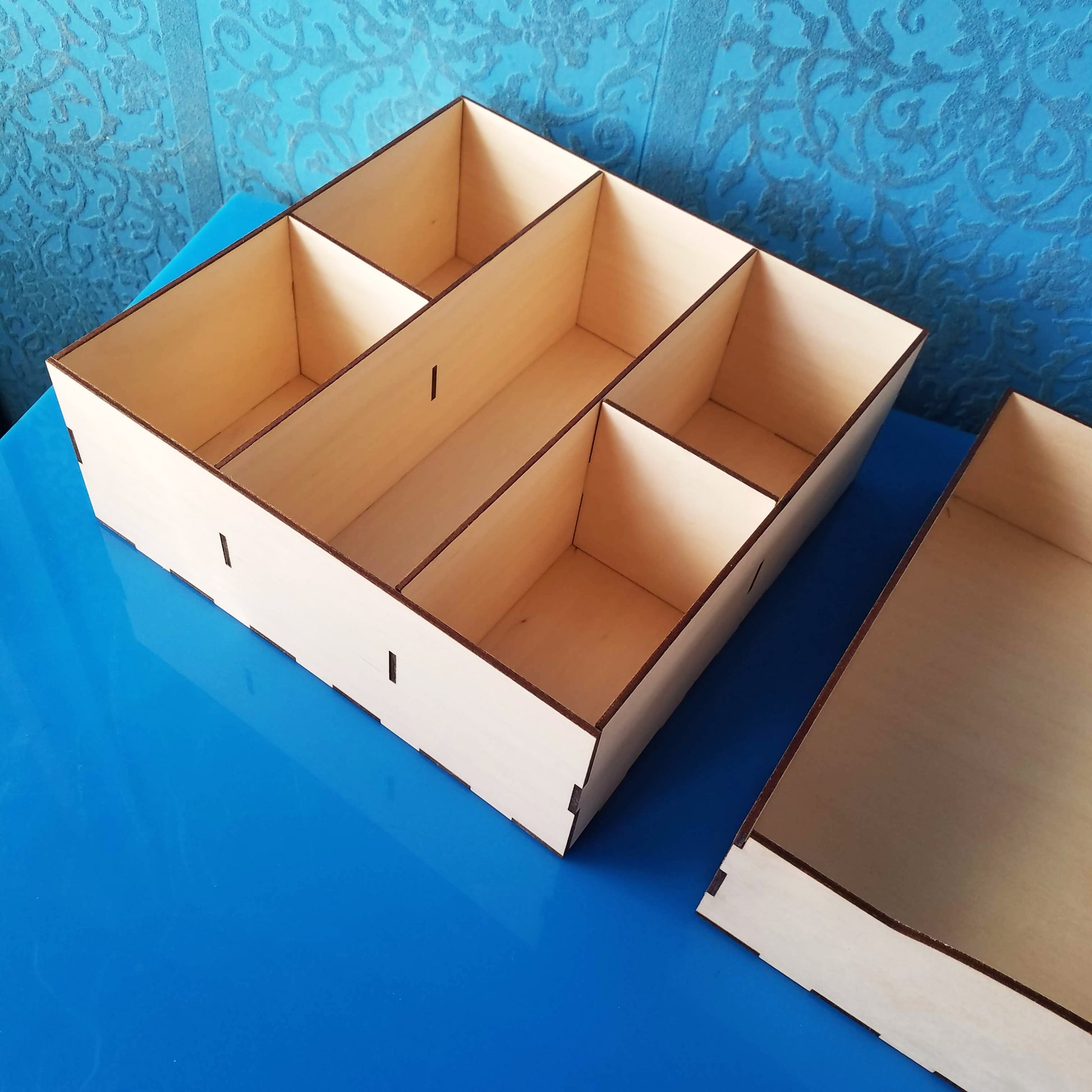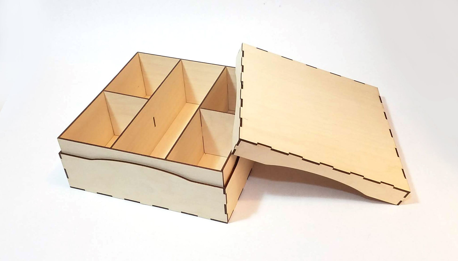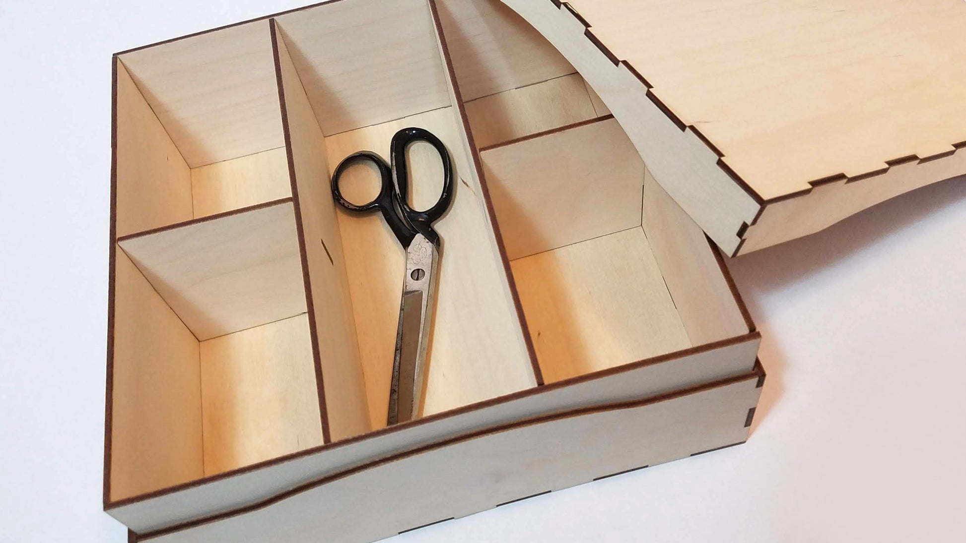 Files include a variant that has dividers, and one that does not. Divided version has it's own bottom and can be lifted out of the main box assembly.