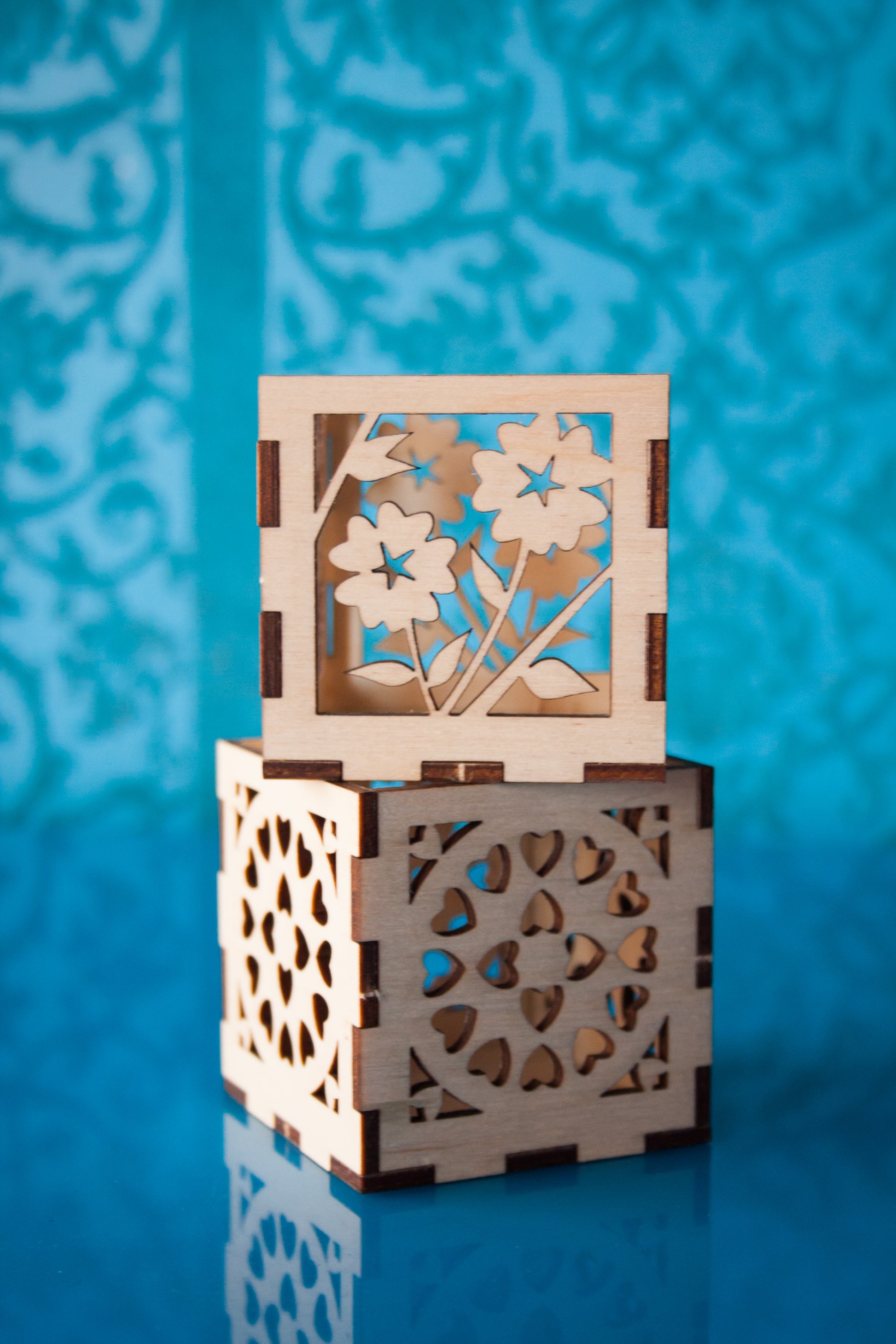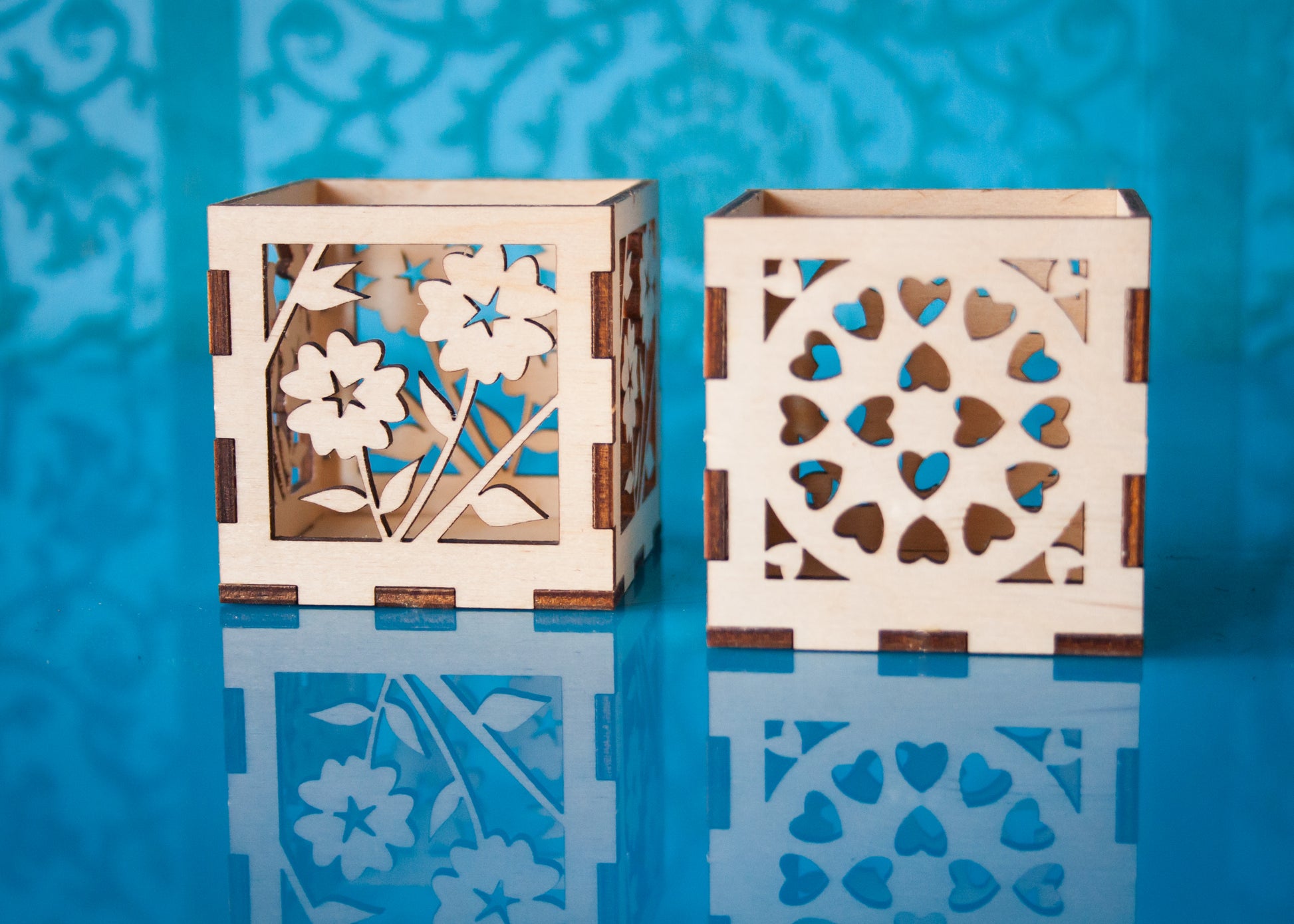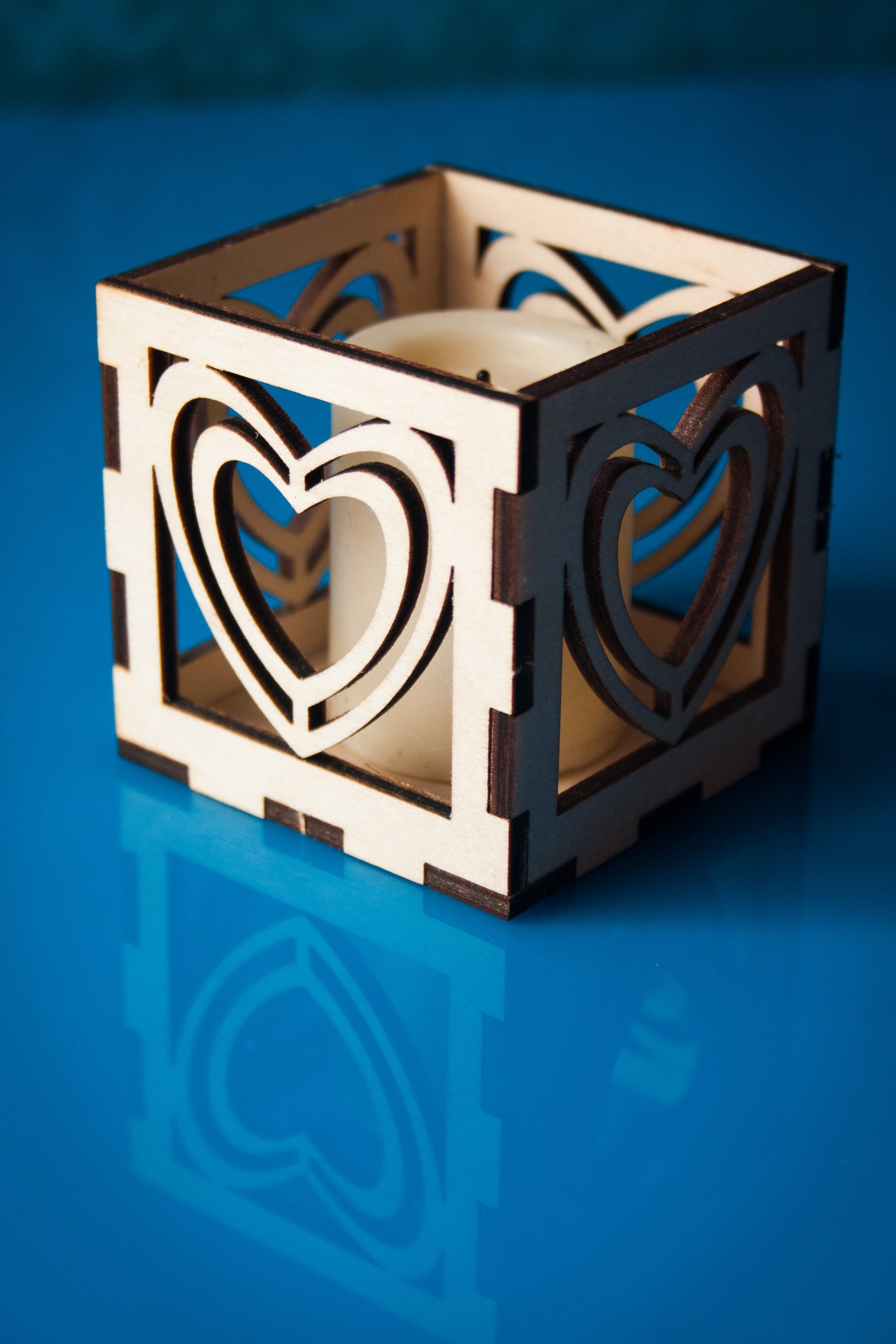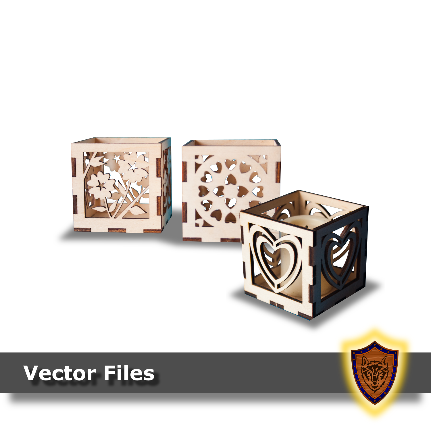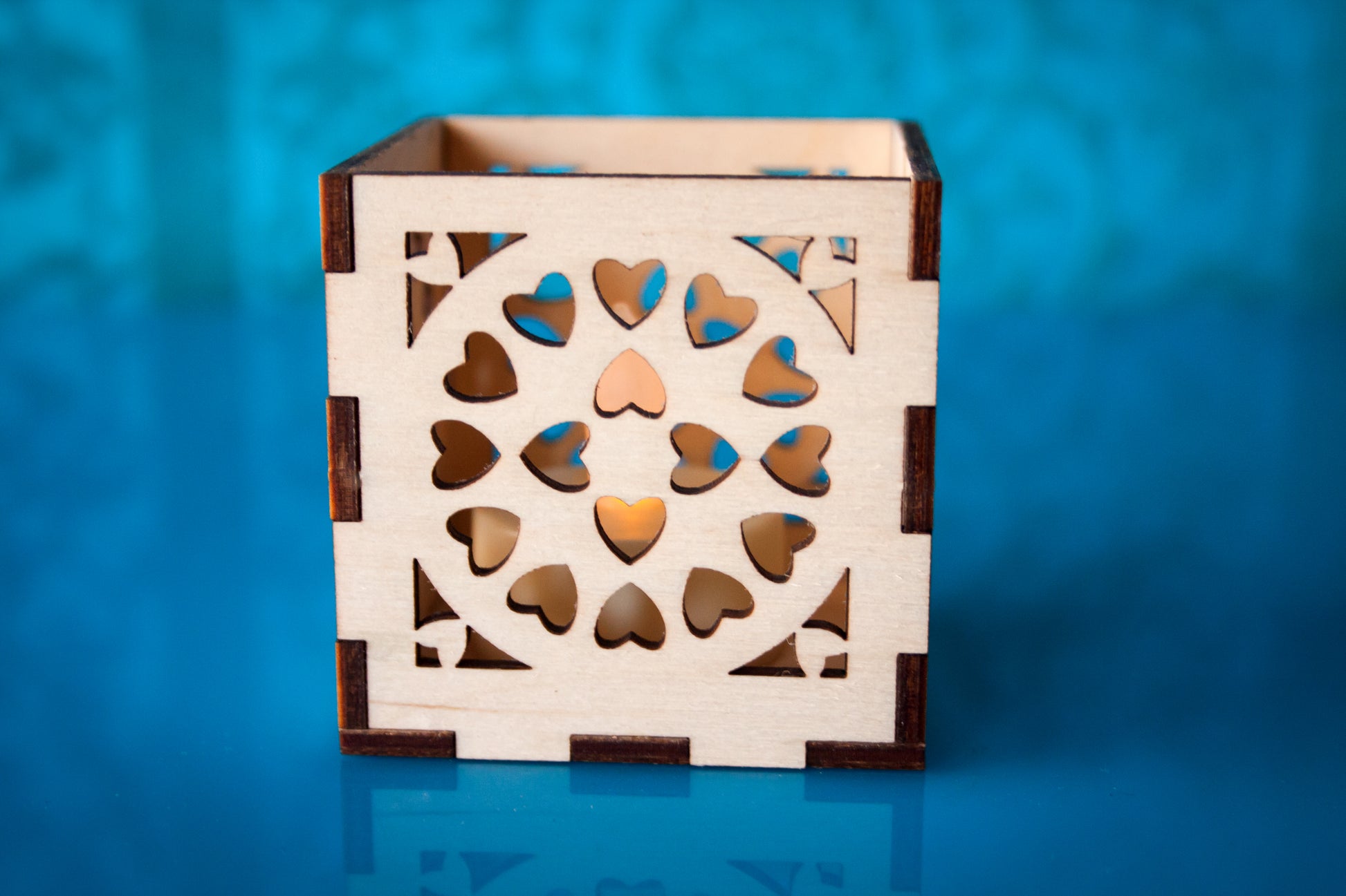 This listing is the digital file for cutting and making your very own laser cut Valentines Luminaries. There are three different designs in the file, A flower with hearts, a circular heart design, and heart shaped design. You will receive a .zip file with the .svg, .eps and .dxf. The luminaries are designed to use 3mm thick material. For best results, be sure to sand your box after laser cutting.