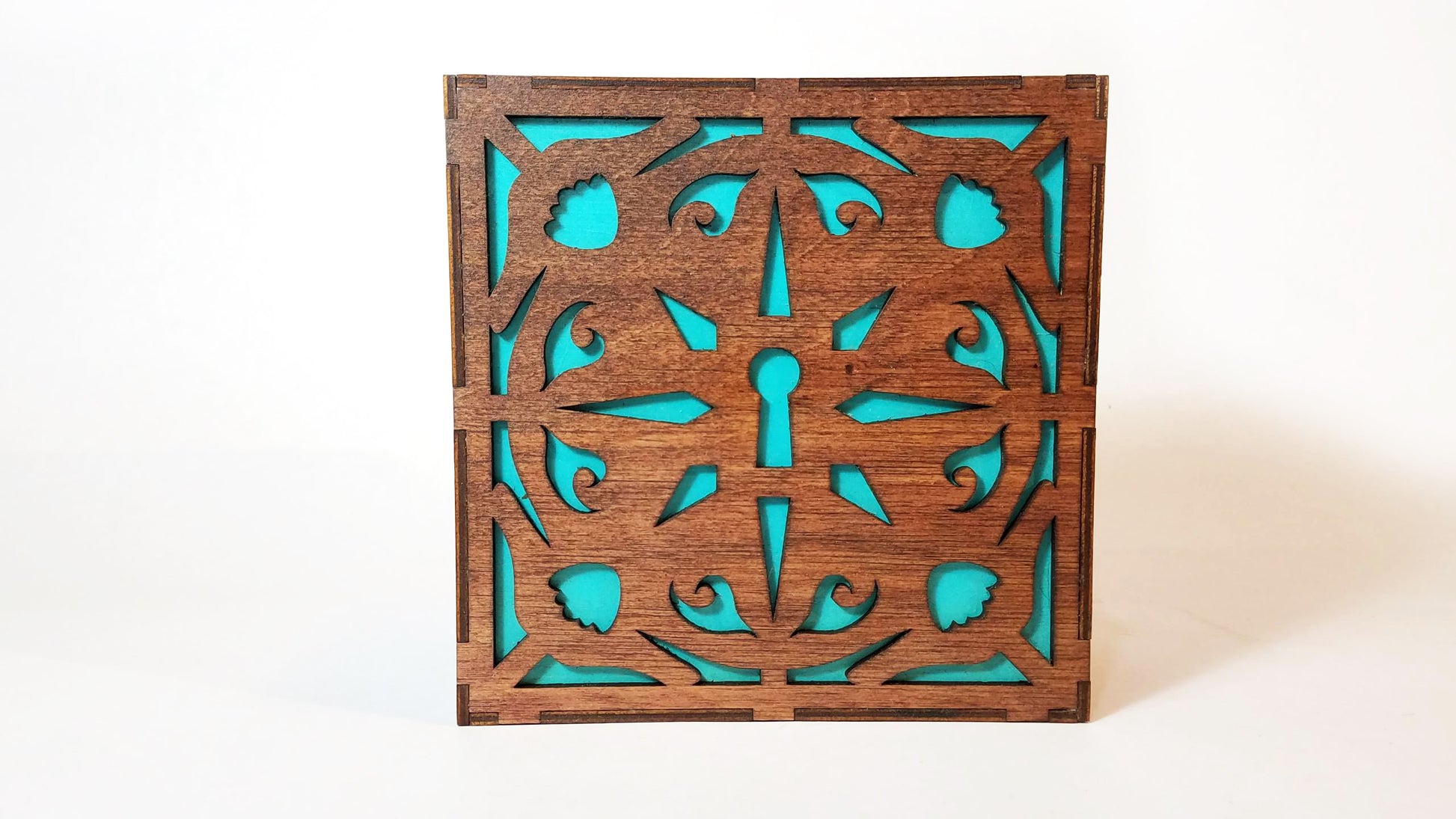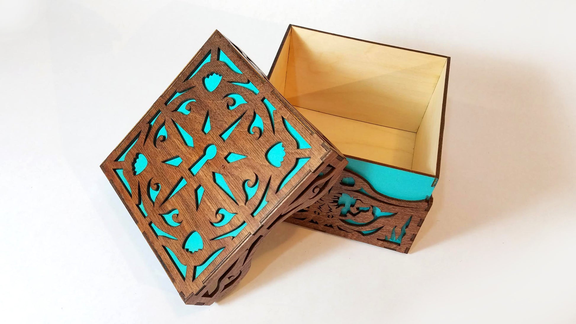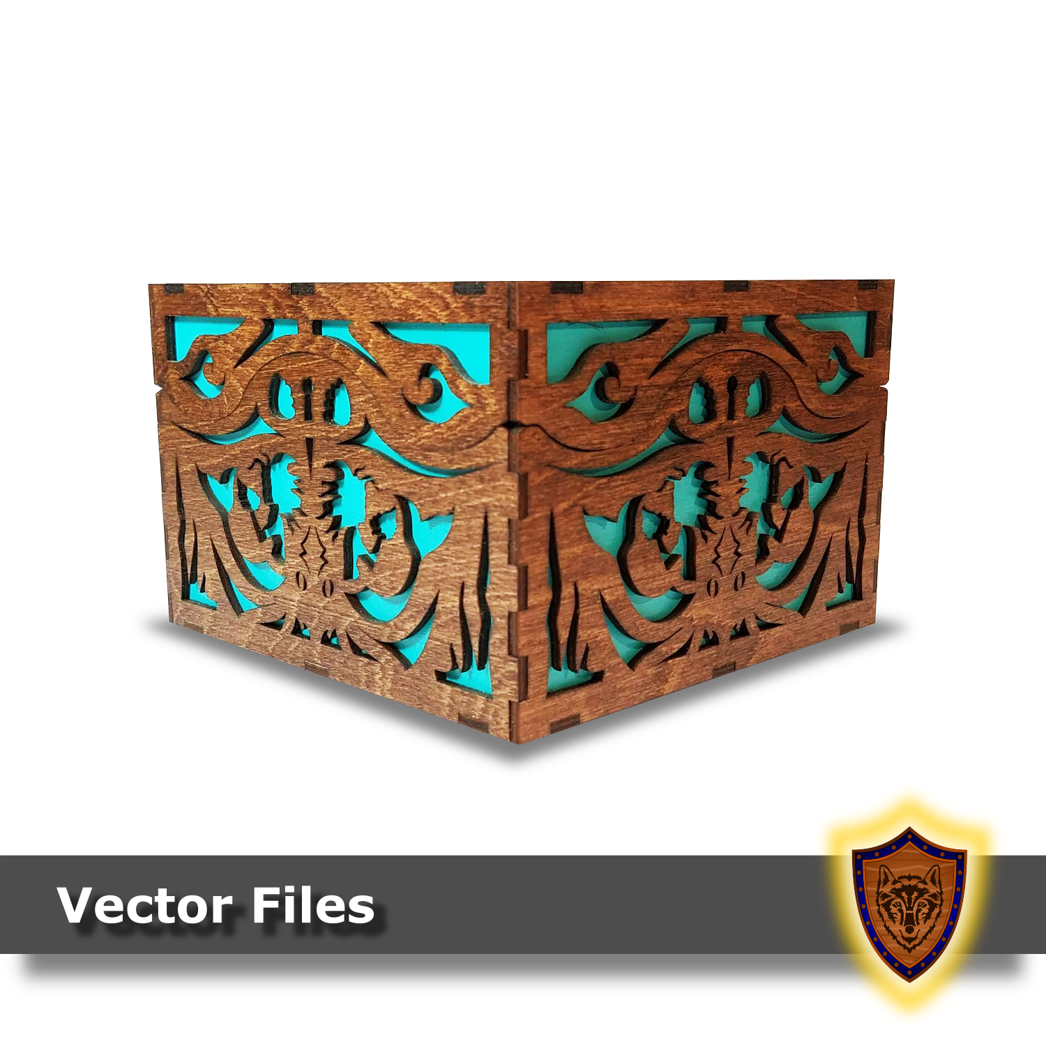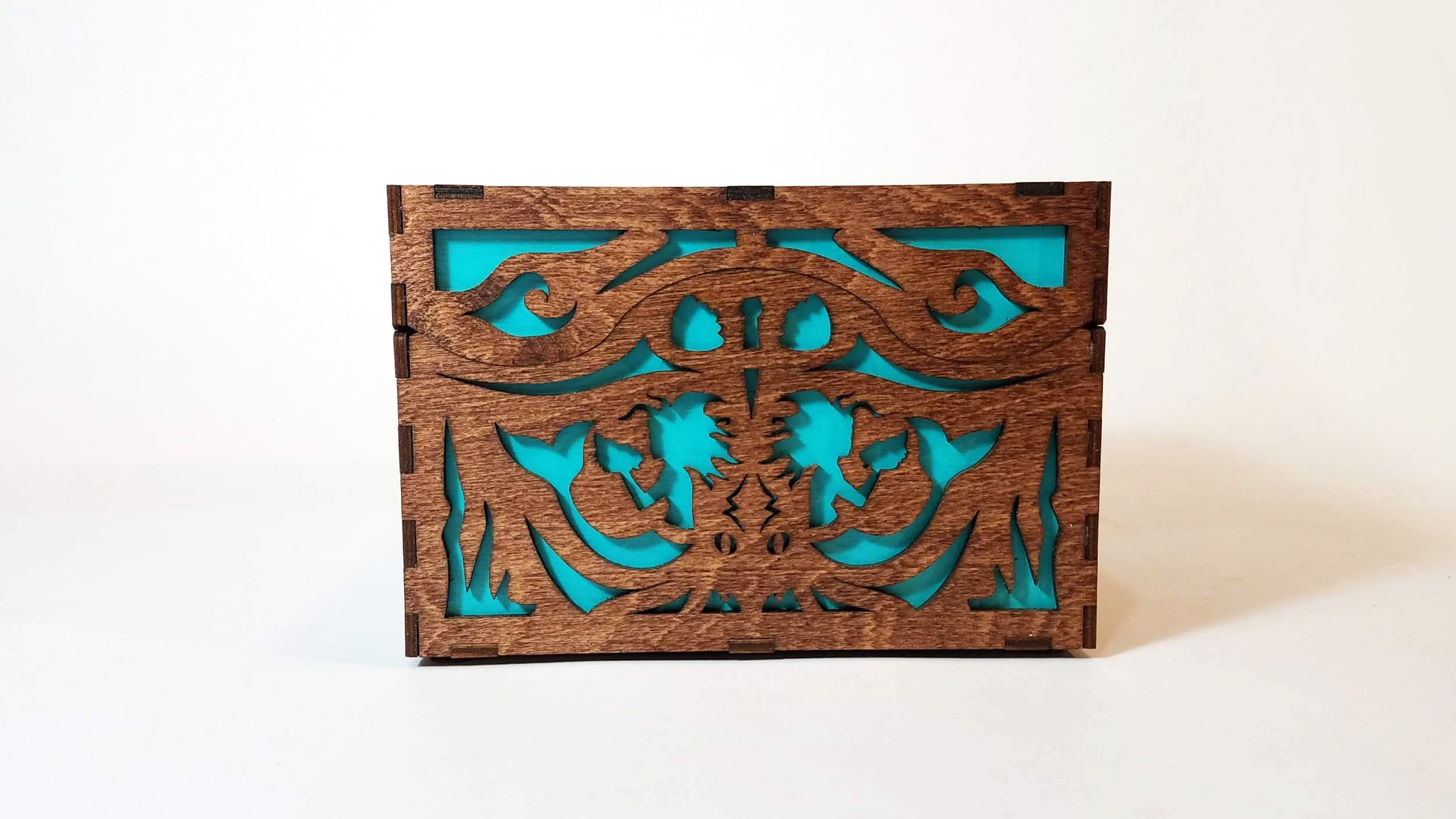 This intricately cut Fantasy Box design features Nautical motifs and is designed for gamers. It can be combined with our Fantasy Box Tray files (sold seperately) to add custom storage for cards, dice, miniatures, tokens and more.