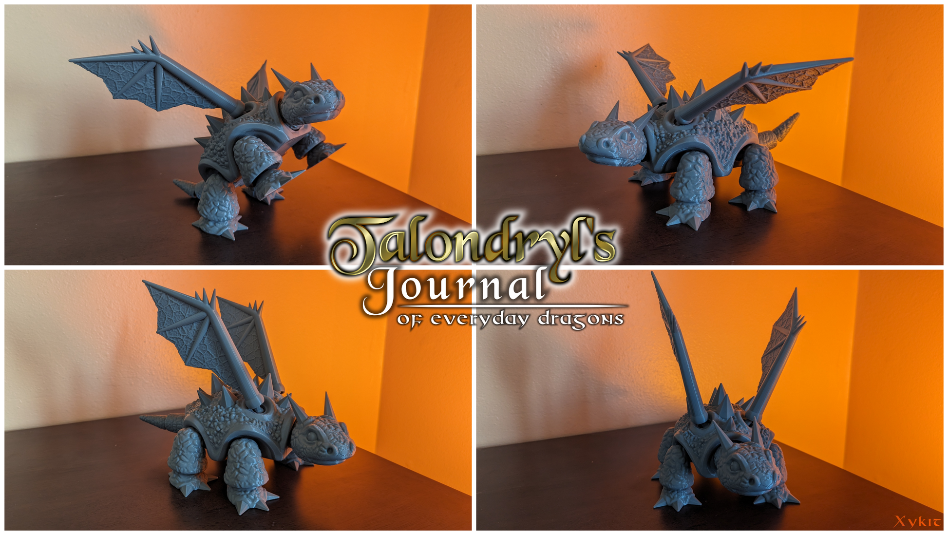 The Rock Shell Dragon, from Talondryl's Journal of Everyday Dragons is a 3D printable beast with 15 pieces and 14 points of articulation. This creature prints in multiple parts and requires assembly. You will need to print 14 of your desired tightness of ball joint clips as well.