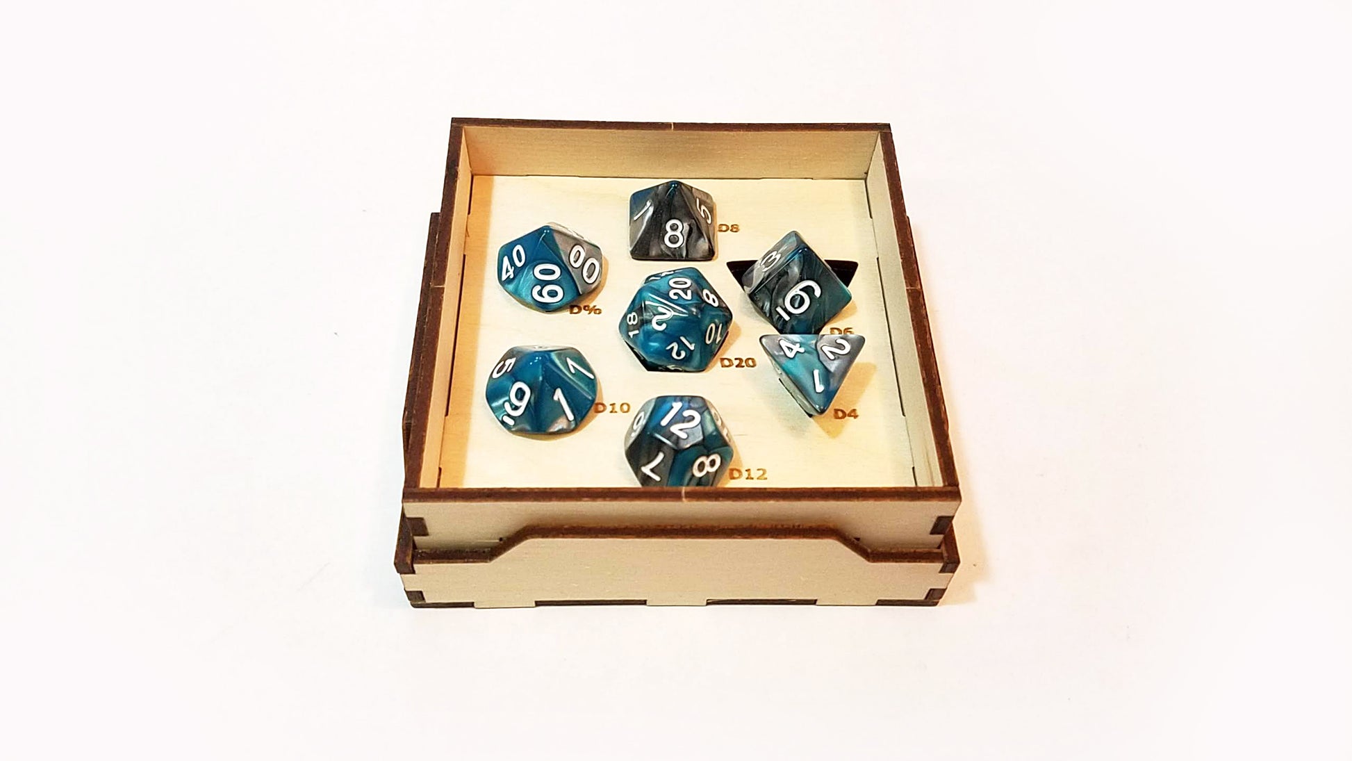 Are you a gamer and a maker? Do you love dice? Protect your dice with this laser cut dice box. Zip file includes 4 variations of the box, with slots for the dice, or open and a slightly taller version of each in case you use slightly larger dice. Shown with standard sized RPG dice (d6 15mm square, d20 18mm face to face). Standard open box can hold up to 50 15mm d6.