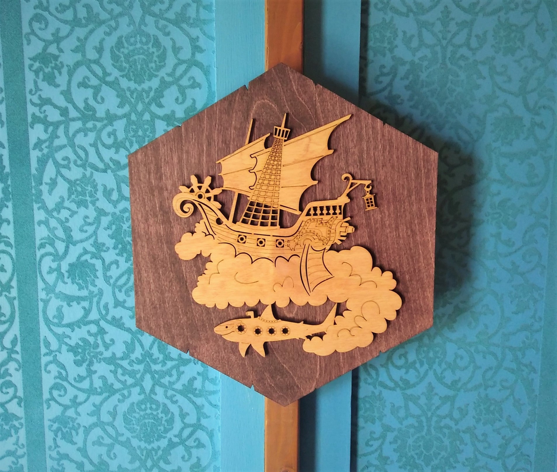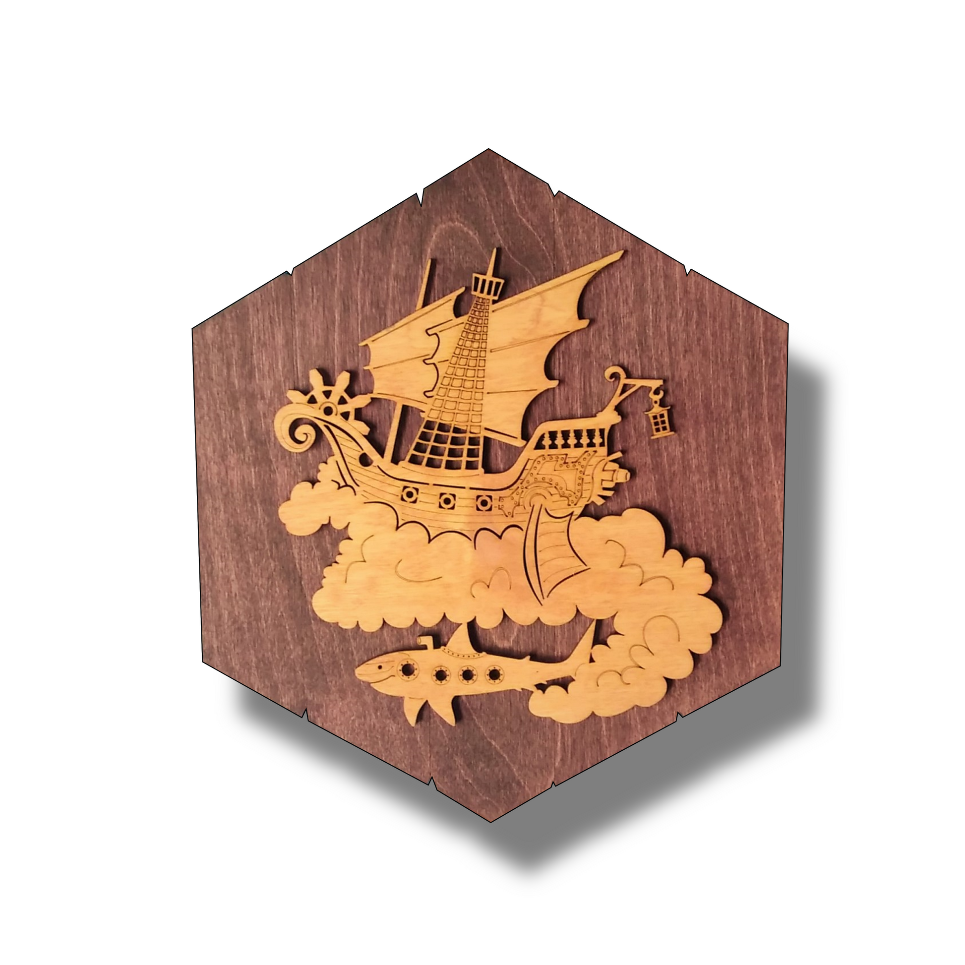 This design features a Steampunk style air-ship and shark.